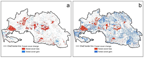 (a) Global Forest Change (GFC [1]) data vs. (b) our forest cover change product for the period 2000–2020.