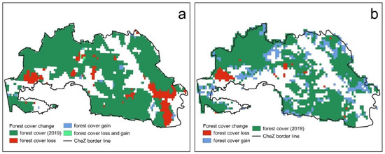 (a) Historic Land Dynamics Assessment (HILDA [29]) forest cover change data for the period 1960–2019 vs. (b) our forest cover change product for the period 1986–2019. The spatial resolution of both maps is 1 km2.