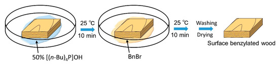 When considering the chemical modification of wood, the depth of chemical treatment is another important issue. Uniform chemical modification of the interior of wood is challenging and generally a complex and time-consuming process. Moreover, chemical modification of wood can alter the properties of the original wood, for better or for worse, sometimes leading to new problems in the modified wood [7,10]. For example, if the humidity control ability of the wood is reduced, dew condensation and mold are generated when these modified woods are used as interior materials, which creates an unfavorable situation in terms of health and hygiene. Therefore, as an attempt to take advantage of the characteristics of both natural wood and chemically modified wood, surface etherification of wood is being studied. Benzylation is a promising chemical modification method that can impart thermoplasticity, water resistance, dimensional stability, and biodeterioration resistance to wood [11]. Among various chemical modifications, the acetylated wood has been studies most actively and is being put into practical uses. Compared to the acetylated wood, the benzylated wood has advantages such as high hydrophobicity and ultraviolet absorption capacity. However, the benzylation is less reactive than the acetylation and requires a longer stirring at higher temperature. In the conventional method, the surface of wood is generally pretreated with a high concentration sodium hydroxide (NaOH) aqueous solution, followed by immersion in a benzylating reagent with stirring at approximately 120 °C for several hours. Because it requires long heat treatment in a closed system at the laboratory level, there are restrictions on the size of wood that can be treated. In addition, depending on the pretreatment conditions and the subsequent benzylation treatment, several problems may occur, such as undesired blackening or whitening of the wood and roughening of the wood surface [12]. For these reasons, it is difficult to use the conventional benzylation methods for the industrial process.