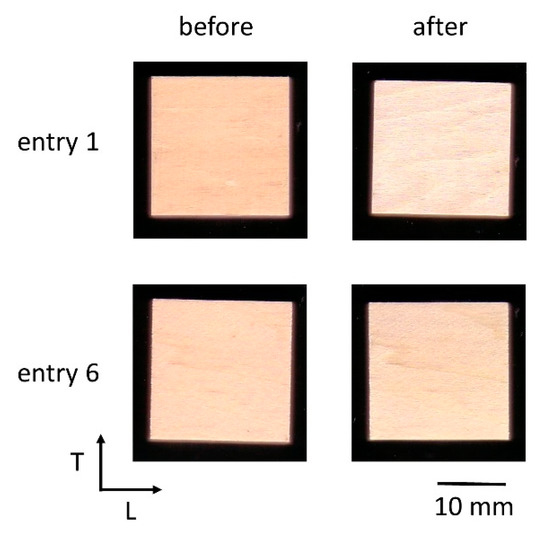 To degrease the wood specimens, Soxhlet extraction was carried out using methanol for 24 h and then hot water for 24 h. Then, the sample was washed with distilled water. The degreased wood was dried at 35 °C under vacuum for 24 h (entry 0 in Table 1).