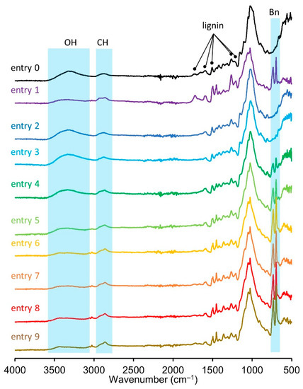 Figure 3 shows the ATR-IR spectra of the precursor (degreased wood, entry 0) and benzylated wood samples. The intensity of these spectra was standardized based on the peak intensity derived from the C-O single bond appearing at 1060 cm−1. The peak intensity of the hydroxyl groups (3100–3600 cm−1) decreased significantly after the benzylation treatment. However, IR peaks attributed to the benzyl groups appeared at 736 and 695 cm−1 [15]. In addition, IR peaks between 3090 and 3063 cm−1, related to the aromatic C-H deformation [16], were observed in some wood samples (Figure 3, entries 1 and 6–9). These changes indicate that the hydroxyl groups were replaced with benzyl groups. According to our previous study, the relative peak intensities in the ATR-IR spectra accurately reflect the reactivity of benzylation [13]. Therefore, the decrease in the rate of the hydroxyl group-derived peaks and the increase in the rate of the aromatic ring-derived peaks were calculated. The decrease rate of the OH-derived peaks was calculated based on the ratio of the peak intensity obtained from the OH stretching vibrations at 3000–3600 cm−1 to the peak intensity obtained from the CH stretching vibrations at 2800–3000 cm−1 (OH/CH intensity ratio). The increase rate of the benzene ring-derived peaks was calculated based on the ratio of the peak intensity obtained from the mono-substituted benzene rings at 680–714 cm−1 to the peak intensity obtained from the CH stretching vibrations (Bn/CH intensity ratio). The lower the OH/CH intensity ratio and the higher the Bn/CH intensity ratio, the higher the number of hydroxyl groups replaced with benzyl groups. These results are presented in the right column of Table 1.
