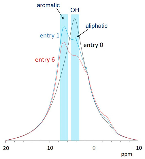 As demonstrated in our previous study on the chemical modification of Japanese cypress [17], hydrophobicity and moisture balance can be monitored using the 1H MAS NMR method. Figure 4 shows the 1H MAS NMR spectra of the degreased and benzylated wood plates in the air-dried state. The degreased wood plate (entry 0) exhibited a large broad-singlet peak around 0–10 ppm, which was attributed to the overlapping of constituent polymers and the moisture in the wood plate. After benzylation using both the conventional (entry 1) and new (entry 6) methods, this large signal derived from water molecules decreased, and the benzyl signal newly appeared in the aromatic region (at approximately 7 ppm). Based on the 1H MAS NMR spectra of modified wood in the heat-dried state [17], benzylation improved the hydrophobicity of the wood plate, as evidenced by the lack of water molecules.