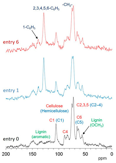 Solid-state NMR spectroscopy can provide information regarding the chemical changes in each substituent of the constituent polymers (cellulose, hemicellulose, and lignin) in woody materials. Here, entry 1, prepared via the conventional method, and entry 6, prepared via the new method, were subjected to solid-state NMR spectroscopy measurements. As a reference, the same measurements were conducted for entry 0, which had only been degreased.
