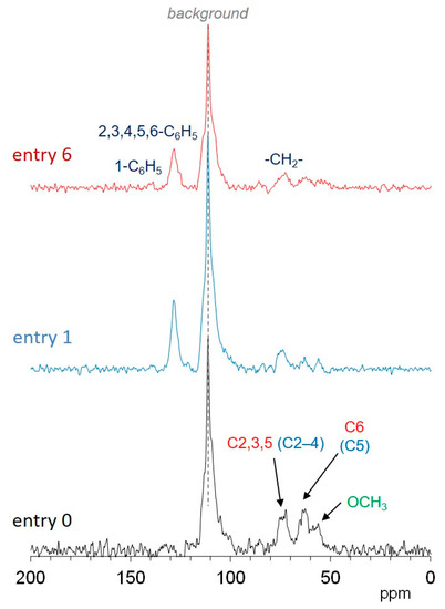 13C PST-MAS NMR spectra of degreased wood (entry 0, black) and benzylated woods (entry 1, blue; and entry 6, red).