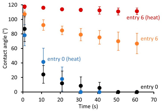 Water contact angles on the degreased wood (entry 0) and benzylated wood (entry 6) surfaces before and after heat treatment. Error bar shows the standard deviations based on the values of 3–5 samples.