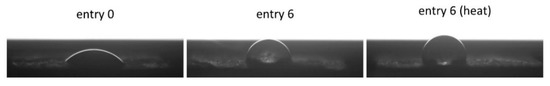 Contact angles for water droplets after 11 s on degreased wood (entry 0), benzylated wood (entry 6), and heat-treated benzylated wood (entry 6 (heat)) surfaces.