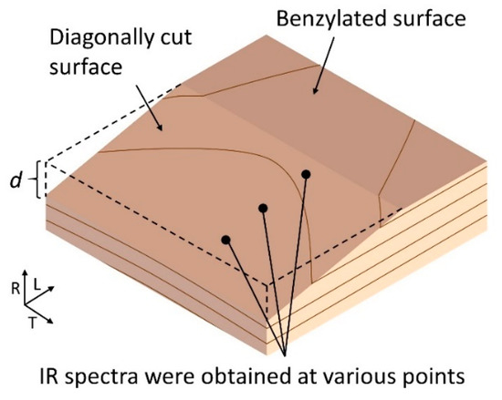 A small test piece (5 mm × 5 mm × 5 mm) cut from the benzylated wood sample was subject to heat treatment. The test piece was placed on a hot plate at 150 °C with the benzylated surface facing down, a weight of about 3 g was placed on it, and it was heated for 1–10 min. After cooling to 25 °C in the drying chamber, it was subjected to various experiments.