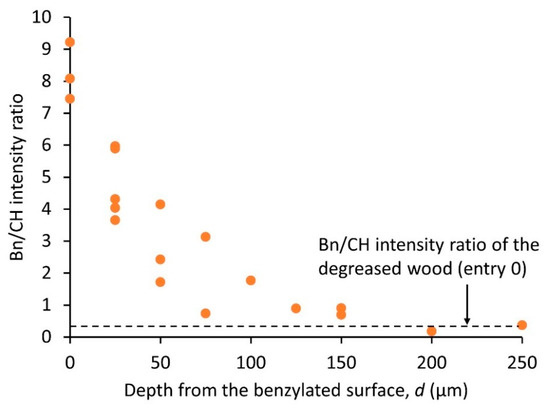 To elucidate the depth up to which wood should be benzylated in order to achieve the above-mentioned excellent hydrophobicity, the depth of benzylation for the wood surface in entry 6 was evaluated. As shown in Figure 9, the surface of entry 6 was cut diagonally, and ATR-IR spectra were measured at various points. By calculating the depth from the wood surface (d) at each measured point and examining the relationship with the value of the Bn/CH ratio, the depth up to which benzylation had progressed was determined. Based on these examinations, it was found that only the areas in close vicinity to the surface were benzylated (Figure 10). The Bn/CH ratio at a depth of approximately 50 μm from the benzylated surface was less than half that at the surface. In addition, the Bn/CH ratio at approximately 200 μm from the surface was almost the same as that of degreased wood. This implies that only approximately 1–2 cells near the surface were benzylated and the internal cell walls at greater depths underwent negligible benzylation. The above results indicate that a significantly low thickness of the benzylated layer from the surface is required to obtain hydrophobic wood with a water contact angle exceeding 110°. This suggests that the wood surface can be hydrophobized by simply applying a chemical solution, washing, and a short heat treatment, given that benzylation up to greater depths is not required. This may facilitate the hydrophobization of wood with a large surface area. This is difficult to achieve using the conventional method, which requires prolonged periods of heating and stirring.