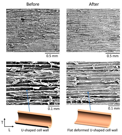 Wood surfaces were observed using scanning electron microscopy (SEM, JSM-IT500; JEOL Ltd., Tokyo, Japan) with an Au coating over the surface (Quick Coater VPS-020; ULVAC Ltd., Yokohama, Japan).