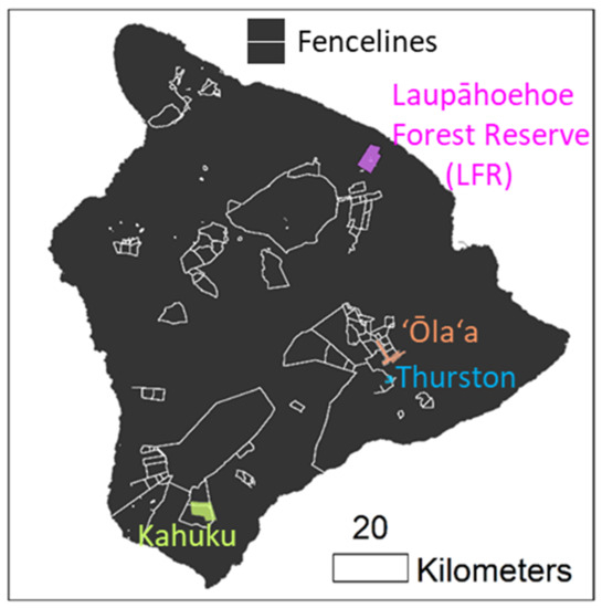 The strong fence line pattern observed across the four sites included in this study may be the result of the increased wounding that ungulates sometimes inflict on ‘ōhi‘a trees. Ranched cattle in rotational grazing systems in Hawai‘i with supplemental water, feed, and mineral blocks have their nutritional needs met and only rarely strip ‘ōhi‘a bark (Riley De Mattos, personal communication). Feral cattle without those supplements are more likely to engage in bark stripping, creating wounds on ‘ōhi‘a trees and pathways for ROD infection. Feral pigs, with their larger population numbers and rooting, rubbing, and browsing behaviors [64,65], may be even more important as wounding agents for the spread of ROD.
