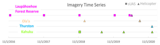 The helicopter imaging system also allowed us to greatly expand our areas of survey. For example, early sUAS operations in the LFR covered an area of 60 ha, while the May 2020 helicopter survey covered > 2600 ha (Figure 5). In densely forested areas with limited visibility on the ground and few options for take-off and landing, sUAS operations can be very challenging [58]. The helicopter system allowed us to obtain aerial imagery over much larger areas with a spatial resolution equivalent to what we can obtain with sUAS platforms and also allowed us to collect imagery in areas that were chronically cloudy and challenging to image acquisition using satellite platforms. Within the near future, with more capable platforms and changes to the regulatory framework for beyond visual line of sight operations [59,60], we anticipate replacing the manned helicopter imaging system with a UAS platform. Until that time, in Hawai‘i and other places with rugged and remote terrain and persistent cloud cover, helicopter-based imaging systems can support a variety of conservation and land management needs over landscape scales [61,62,63]. An added benefit of this system is improved safety margins for aerial survey teams. In the past, such surveys would occur with a team of one to three onboard spotters. This system eliminates or greatly reduces the risk to these staff.