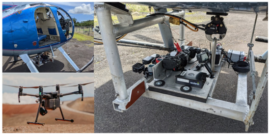(Top left and right panel) Custom imaging payload developed for Hughes 500 helicopter mapping operations in Hawai‘i. (Bottom left) sUAS platform used for mapping operations.