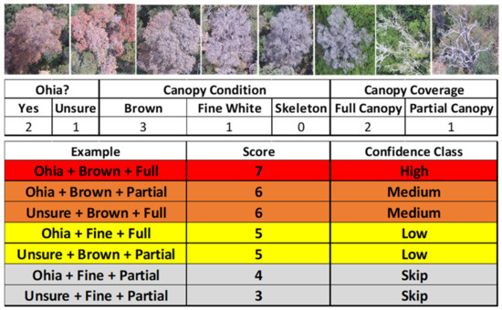 Following each imaging flight, trained and experienced human analysts identified suspect trees from original individual geotagged images and derived orthomosaics created via structure-from-motion (SfM) software Pix4D Mapper Pro (v4.5, Zurich, Switzerland) using standard settings. A set of reference photographs of confirmed ROD trees exhibiting various stages of canopy condition were used to assist with identification. A numeric system based on species identification and canopy condition was developed to provide confidence ratings (i.e., high, medium, or low) for individual trees suspected of ROD based on high resolution sUAS and helicopter RGB imagery (Figure 4). ‘Ōhi‘a is the dominant tree species in our study areas; it is generally readily identifiable, but shade and image blur can occasionally challenge species identification. Suspect trees designated as high confidence targets were determined to be ‘ōhi‘a trees exhibiting full reddish-brown canopies. Geographic coordinates of the center point of each suspect tree were determined from the orthomosaics.