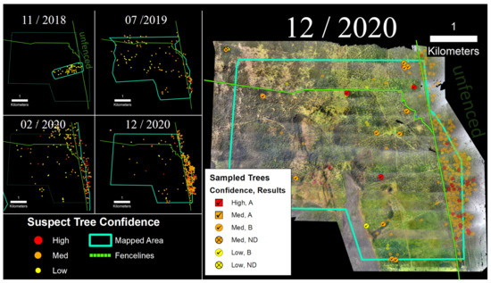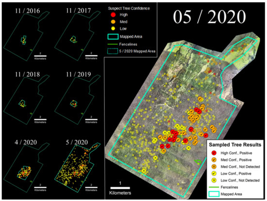 Together, our methods provide a time-series sequence of suspect tree points for each of the four study sites, with associated confidence levels from the areas covered by our imaging platforms. The imaged area increased over time for those sites where we initially relied on sUAS imagery alone and/or where we decided to expand the imaged area based on results from the prior flight. For the most recent imaging campaign included in this study, sampled points along with their confidence ratings are also shown. Not every suspect tree identified via aerial imagery was visited and sampled.