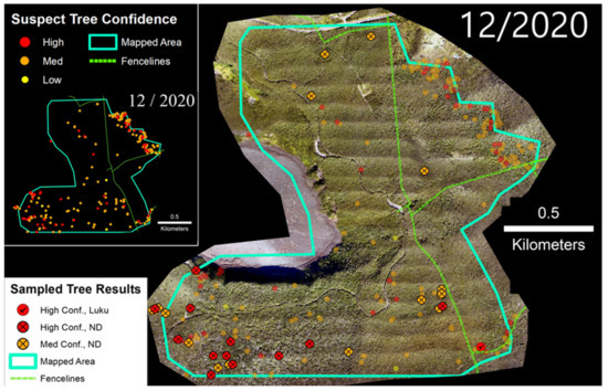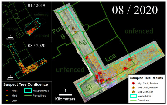 We employed the helicopter imaging system to survey the ‘Ōla‘a tract of Hawai‘i Volcanoes National Park in January 2019 and again in August 2020 (Figure 6). The January 2019 survey (550 ha) covered the southeastern corner of the Koa Unit and portions of the surrounding unfenced forest. Results revealed a strong fence line signal with much higher densities of suspect trees in the outer unfenced area where ungulates were present (1.14 suspect trees/ha) compared to within the fenced Koa Unit (0.02 suspect trees/ha). Six sampled trees located within the Koa Unit detected from the 2019 survey tested positive for C. lukuohia. Our surveyed area more than doubled in August 2020 to 1200 ha. Following that survey, we observed a much higher density of suspect trees within the Koa Unit (i.e., 2.78 suspect trees/ha). Of the 56 sampled trees following the 2020 survey, 86% of the medium confidence trees and 100% of the high confidence suspect trees tested positive for C. lukuohia (Table 2). Four non-detections were collected from medium confidence suspect trees located in the northern Pu‘u Unit.