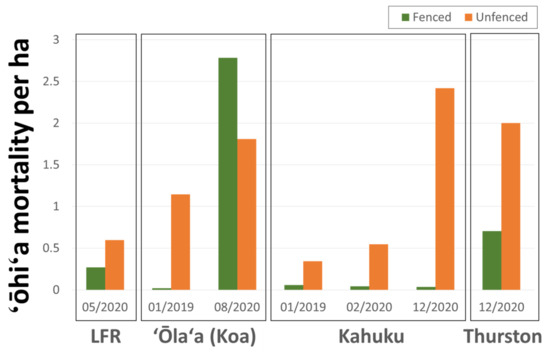 Suspect tree densities were determined for fenced and unfenced areas within each survey date using the generated suspect ROD tree point data, the surveyed area, and a GIS fencing layer for Hawai‘i island provided by the Hawai‘i Division of Forestry and Wildlife and updated by the Rapid ‘Ōhi‘a Death Data Manager (Brian Tucker, personal communication). For the May 2020 LFR helicopter survey, we determined the unfenced suspect point density for a core ROD infested area of 550 ha rather than the full 2600 ha coverage, which included pasture and other agricultural areas. The fenced area for the LFR was composed of multiple small exclosures that collectively amounted to 7.3 ha. Unfenced areas for the other three sites were the continuous imaged areas bordering the fenced-in units.