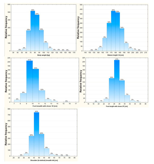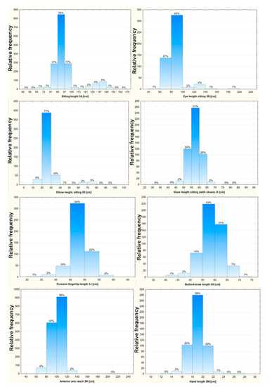 Figure 3 and Figure 4 show histograms of the analyzed selected anthropometric dimensions in accordance with the EN ISO 3411 standard, and their intervals. Figure 3 shows anthropometric dimensions that are not directly connected with the sitting position. The stature height of half of the analyzed adult men ranged from 175 to 185 cm, and the body weight of more than half of the men ranged between 70 and 90 kg. These ranges were consistent with values that are slightly above the mean in comparison to the parameters of average earthmoving machine operators according to the EN ISO 3411 standard. The forefoot width of almost half of the analyzed sample ranged from 9 to 10 cm, and the foot length with shoes ranged from 26 to 28 cm. These values correspond with values slightly below the mean or the mean values of operators in accordance with the standard. However, in the case of the remainder of the analyzed adult men, significant variability was observed in this body dimension.