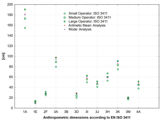 The analysis provides an overview of the standardized dimensions of earthmoving machine operators, and assesses whether these dimensions are current. The body weight value could not be analyzed because it is not specified in the EN ISO 3411 standard. Figure 5 shows that the mean and most commonly occurring dimensions were slightly above the mean values of the operator, in the case of the characteristics of stature height (1A); sitting height (3A); eye height sitting (3B); elbow height, sitting (3D); knee height sitting with shoes (3I); forearm fingertip length (3J); anterior arm reach (3K); and shoulder (bi-deltoid) breadth (4A).