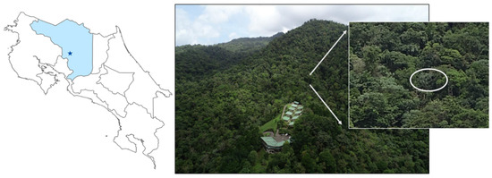 This study was conducted in a mature transitional wet tropical forest at the Texas A&M Soltis Center for Research and Education within the Alajuela Province of Costa Rica (Figure 2). This site is located at 10°23′13″ N–84°37′33″ W and exists in close proximity to San Isidro de Peñas Blancas at an elevation of ~600 m. The area receives ~4200 mm of precipitation annually and has an average annual air temperature of ~24 °C [20]. There is a distinct wet season occurring between the months of May and December, with an average monthly rainfall of ~470 mm and a dry season in which precipitation is still present but markedly lower, ~195 mm per month [17,20]. The experimental research plot resides on a 45° sloped terrain, has an area of 2200 m2, and is centered around a 42 m tall micrometeorological research tower. There are 56 botanically identified tree species located in this plot, with 151 individuals present. Of these species, Carapa guianensis Aubl. has the highest number of individuals present (31 individuals), while M. anisophyllum species are the largest trees found in the plot and make up a disproportionate amount of the basal area present (i.e., all three M. anisophyllum trees account for 54% of plot basal area). Tree size within this plot is highly variable, with DBH ranging from 6 to 220 cm and height ranging from 6 to 40 m. Canopy structure consists of interwoven tree crowns between individuals, with frequent small canopy gaps distributed throughout the plot. Tree dominance classification (i.e., subdominant, mid-story, suppressed), height estimates, and species plot data were used from field observations collected by Aparecido, Miller, Cahill and Moore [17]. Previous studies have shown the importance of this canopy structure for accurately representing the forest in models of the land surface and its carbon and water cycling [21].