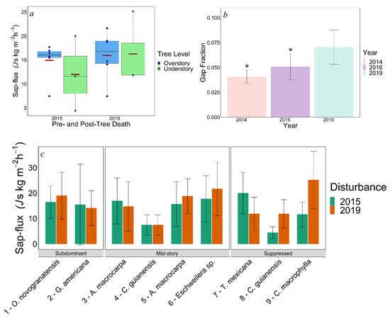 (a) Graph of average sap flux (Js) of overstory (O) and understory (U) trees sampled in 2015 and 2019. Each maroon marker indicates the mean for its respective canopy level. (b) Average gap fraction for 2014, 2016, and 2019. (c) Average individual tree sap flux from 2015 and 2019 study periods. Numbers in figure (c) identify species with respect to Table 1. Error bars on figures (b,c) indicate standard deviations. Asterisks indicate statistical significance.