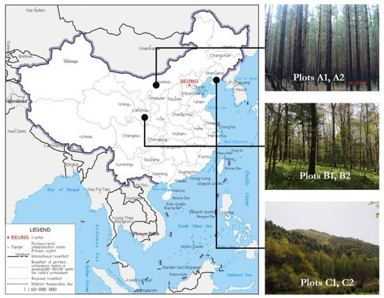 Six long-term positioning forest plots of 100 × 100 m2 were analyzed (Table 1). All trees with DBH greater than or equal to 5 cm were labeled. Tree coordinates, species, DBH, height, crown were recorded by a total station (a Total station-G.T.S. 602AF, Topcon Sokki Co., Ltd, Tokyo, Japan). These natural forests were located in different regions of China (Figure 1). Plots A1 and A2 were Pinus sylvestris forests in the sandy land north of the temperate zone, established in 2015. Plots B1 and B2 were mixed forests of pinus and quercus in the transition zone from subtropical to warm temperate zone, established in 2009. Plots C1 and C2 were mixed forests of Pinus koraiensis and broad-leaf forests in the central temperate zone, established in 2002.