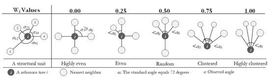 Wi can assume five discrete values. The four neighbors and the reference tree named a structural unit for convenience. The structural unit was an even structural unit if Wi = 0 or 0.25. The reference tree was an even tree. The structural unit was a clustered structural unit if Wi = 0.75 or 1. The reference tree was a clustered tree. The structural unit was a random structural unit if Wi = 0.5. The reference tree was a random tree [18].