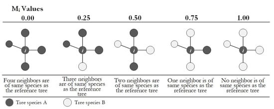 The Mingling degree depicts the probability that the nearest neighbor of any reference tree is of different species [22]. Mi assumes five values, as shown in Figure 4.