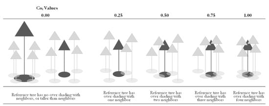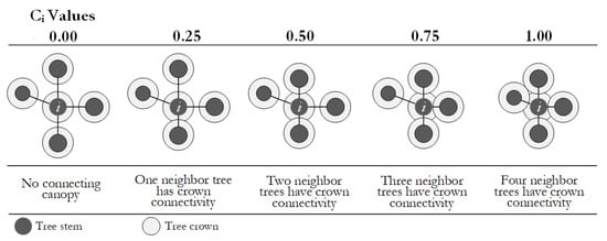 Crowding degree analyzes the forest crowding and local density based on the crown connection degree in a structural unit. Ci assumes five values, as shown in Figure 5.
