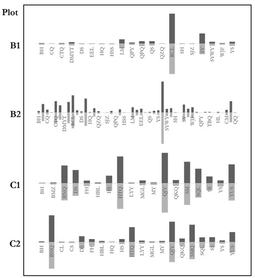 Abundance distributions of stands and random trees. Distributions of the stands are above the horizontal axes. Distributions of the random trees are below the horizontal axes. Species of C2 are not all listed to save space. BH, Betula platyphylla Suk.; CQ, Kalopanax septemlobus (Thunb.) Koidz.; CTQ, Acer ginnala Maxim.; DMYT, Cerasus polytricha; DS, Tilia mongolica Maxim.; EEL, Carpinus turczaninowii Hance; HQ, Sorbus pohuashanensis (Hance) Hedl.; HSS, Pinus armandii Franch.; LM, Swida macrophylla (Wall.); QPY, Acer cappadocicum Gled.; QPQ, Populus cathayana var. cathayana; QS, Toxicodendron vernicifluum (Stokes) F.A. Barkley; QZQ, Acer davidii Franch.; RCL, Quercus aliena var. acutiserrata Maxim.; SY, Populus davidiana Dode; SYWY, Lindera obtusiloba Bl.; WJF, Acer oliverianum Pax; YS, Populus tomentosa Carr.; TBQ, Acer caesium Wall.; HL, Salix cheilophila var. microstachyoides; CM, Aralia chinensis Linn.; QQ, Picea wilsonii Mast.; SH, Betula delavayi; SJZ, Malus baccata (Linn.) Borkh.; BMZ, Syringa reticulata (Bl.) Hara var. Mandshurica (Maxim.) Hara (S. Amurensis Rupr.); BNQ, Acer mandshuricum Maxim.; DS, Tilia mongolica Maxim.; FH, Betula costata Trautv.; HBL, Phellodendron amurense Rupr.; HS, Pinus koraiensis; HTQ, Juglans mandshurica; LYY, Ulmus laciniata (Trautv.) Mayr; MGL, Quercusmongolica Fischer ex Ledebour; MY, Ostrya japonica Sarg.; QUY, Carpinus cordata Bl.; QKQ, Acer tegmentosum Maxim.; SM, Acer mono Maxim.; SQL, Fraxinus mandschurica Rupr.; SS, Abies holophylla Maxim.; YUS, Ulmus pumila Linn.