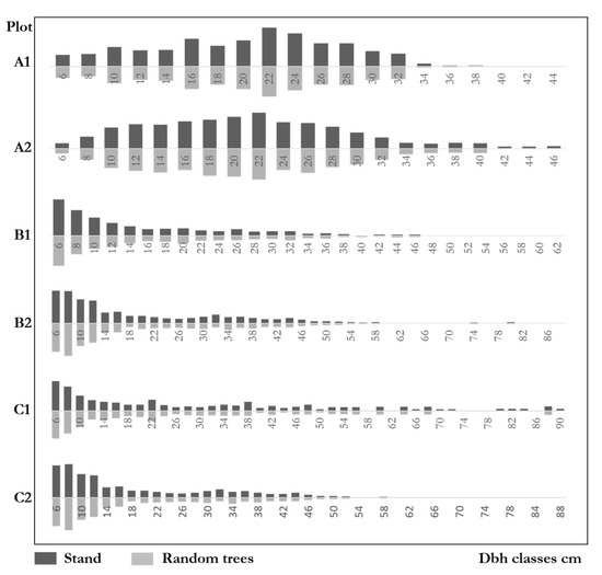 Figure 8 shows the diameter distributions of natural forests and random trees. The distributions of both communities and the random trees were very similar. Furthermore, the ratios of each diameter class on the community level were highly similar to those of random trees. The genetic distance test results of the six plots were: A1: ; A2: ; B1: ; B2; C1; C2. The results indicate that the diameter distributions of random trees were very similar to that of the communities. The maximum difference of the six plots was 10.8%, which was far from the significant difference. The diameter distributions of random trees fully reflect the size distributions in natural forests.