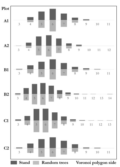 - Zhang, G.; Hui, G. Analysis and application of polygon side distribution of Voronoi 526 diagram in tree patterns. J. Beijing For. Univ. 2015, 527, 37, 1–7. (In Chinese) [Google Scholar]