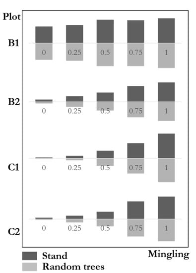 However, a new-built artificial forest may not display this characteristic. Mainly the forest appears as symmetric arrangements with low structure diversity [19]. Artificially increasing the proportion of random trees in plantations to create asymmetric competition could raise the spatial structure heterogeneity and accelerate the near-natural transformation of plantations, which is also one of the applications of this study.