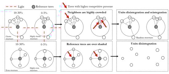 The quantity advantage of structural units can also be further explained using competition relationships. For example (Figure 12), neighbor trees are crowded together in a clustered unit. The reference tree receives light from three sides, occupies more space, showing a larger canopy and higher productivity [38]. Asymmetric competition between large and small neighbor trees may lead to asymmetric competition [39,40,41]. At the same time, the local density between neighbors is high, intensifying the competition as well. Both competitions may reduce the growth of neighbors and eventually to the mortality of trees that are not successful competitors [42,43,44]. Then the clustered structural unit disintegrates, the remaining trees reintegrate with other trees to form a new structural unit. The stronger the aggregation, the more probabilities of disintegrating and reintegrate.