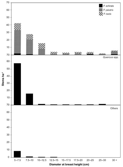 Density (stems ha−1) of trees (live, woody stems ≥5 cm dbh) by dbh bins (cm) documented in a catastrophically disturbed Pinus palustris woodland on the Oakmulgee Ranger District, Talladega National Forest, Alabama, USA.