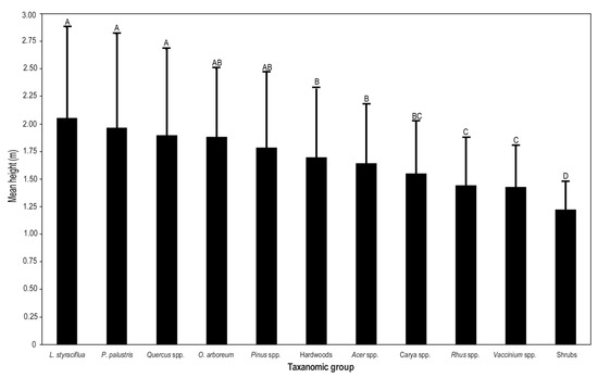 Sapling density was 5119 stems ha−1 (Table 2). The most abundant species in the sapling layer were Rhus copallinum and Vaccinium arboreum. Collectively, these species represented 46% of all saplings on our study plots. The most abundant arboreal species in the sapling layer were Q. falcata, Liquidambar styraciflua, and Q. nigra. No other species represented more than 5% of sapling layer stems. Notably, P. palustris and P. taeda had sapling densities of 74 stems ha−1 and 238 stems ha−1, respectively, and collectively, represented just 6% of all sapling stems. At the genus-level, Quercus represented 28% of all saplings with a sapling density of 1422 stems ha−1. Mean sapling height was greatest for L. styraciflua, but height of this species was not significantly different from P. palustris, Quercus spp., Oxydendrum arboreum, or other Pinus species (Figure 2). Taxa classed with the shrub growth form (see Table 2 for a list) were significantly shorter than all other taxa, including Rhus spp. and Vaccinium spp.