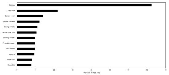 To quantify the relative influence of species and environmental conditions on sapling height growth, we applied a random forest (RF) machine learning algorithm. RF is a non-parametric tool derived from classification and regression trees that is capable of accurately modeling complex interactions between variables [41,42]. The algorithm combines “trees” each generated by bootstrap samples, and retains samples for internal cross-validation (i.e., out of bag estimates, OOB). The final model output is the mean result of all trees. Model outputs include a variable importance measure, which ranks each predictor variable by mean increase in error (% IncMSE) when observed values of predictor variables are permuted through the model [41]. These values allow inference on which predictor variable has the greatest influence on the independent variable within the model. We fit one RF model to predict sapling height incorporating 200 regression trees into the model. Height was modeled for each individual sapling that occurred on our inventory plots (n = 8191). Predictor variables included species, clump size, plot-level canopy cover, sapling species richness, sapling density, Pinus litter cover, tree density, basal area, slope percent, and transformed aspect [43]. All models were cross-validated with a randomly selected training and testing subset of the data and all independent variables were analyzed for multicollinearity. RF was conducted using the package “randomForest” in R version 1.2.5001.