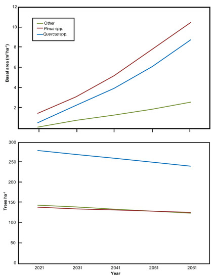 Forest Vegetation Simulator (FVS) model projection of tree basal area (m2 ha−1) and density (stems ha−1) of Pinus spp. (red), Quercus spp. (blue) and other spp. (green) from 2021 to 2061 (stand age 50 years) in a catastrophically disturbed Pinus palustris woodland on the Oakmulgee Ranger District, Talladega National Forest, Alabama, USA.