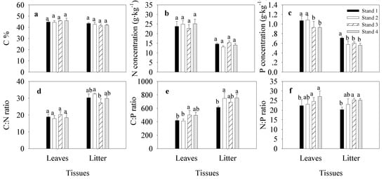 We detected no significant difference in C concentrations between leaves and litter (Figure 1a). N and P concentrations were higher in leaves than litter (Figure 1b,c). The opposite trend was observed in the C:N and C:P ratios, which were lower in leaves than in litter (Figure 1d,e). The litter C:N ratio was significantly higher in Stand 2 than in Stand 3 (Figure 1d). The leaf C:P ratio was significantly higher in Stand 3 than in Stands 1 and 2, and the litter C:P ratio was higher in Stands 2 and 4 than in Stand 1. Leaf and litter N:P ratios were higher in Stands 3 and 4 than that in Stand 1 (Figure 1f). P and N resorption efficiency were significantly higher in Stand 2 than in Stands 1 and 3 (Figure 2).