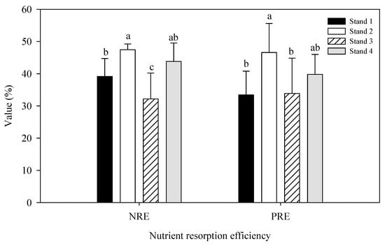 N and P resorption efficiency in four moso bamboo stands. The error bar is the mean value of four samplings (mean ± SD, n = 4), and different lowercase letters indicate significant differences between groups (p ≤ 0.05).