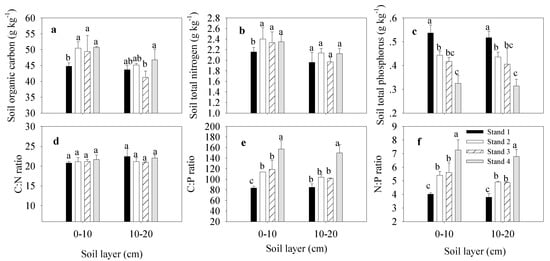 At a soil depth of 0–10 cm, the SOC concentration was significantly lower in Stand 1 than in Stands 2–4. STN was lower in Stand 1 than in all other stands. STP was similar at soil depths of 0–10 and 10–20 cm, with the highest value occurring in Stand 1 and the lowest in Stand 4. C:P and N:P ratios were similar between soil depths of 0–10 and 10–20 cm, with the highest value being in Stand 4 and the lowest in Stand 1.