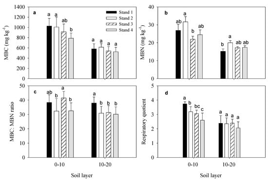Soil microbial biomass C and N, and the respiratory quotient in four moso bamboo stands. The error bar was the mean value of four samplings (mean ± SD, n = 4), different lowercase letters indicate significant differences between groups (p ≤ 0.05). (a–d), is the concentration of soil microbial biomass carbon (MBC), soil microbial biomass nitrogen (MBN), the ratio of soil microbial biomass carbon to soil microbial biomass nitrogen, respiratory quotient in soil 0–10 cm and 10–20 cm.
