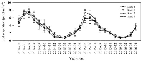 Soil respiration rates monthly dynamic between May 2014 and April 2016 in four moso bamboo stands. The error bar was the mean value of three plots in each stand (mean ± SD, n = 3).