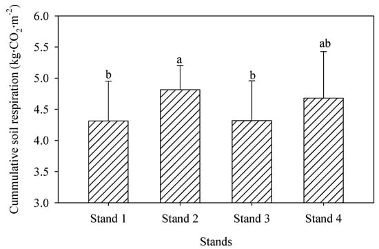 We detected no significant differences in mean annual soil respiration rates among four bamboo stands (3.21, 3.51, 3.17, and 3.40 µmol m−2 s−1 in Stands 1–4, respectively; Figure 5). There was a clearly seasonal dynamic, with maximum values occurring in June or July, and minimum values occurring in January or February. The cumulative soil CO2 emission rates were 4.47 ± 0.48, 4.89 ± 0.31, 4.42 ± 0.54, and 4.75 ± 0.68 kg CO2 m−2 for Stands 1–4, respectively (Figure 6).