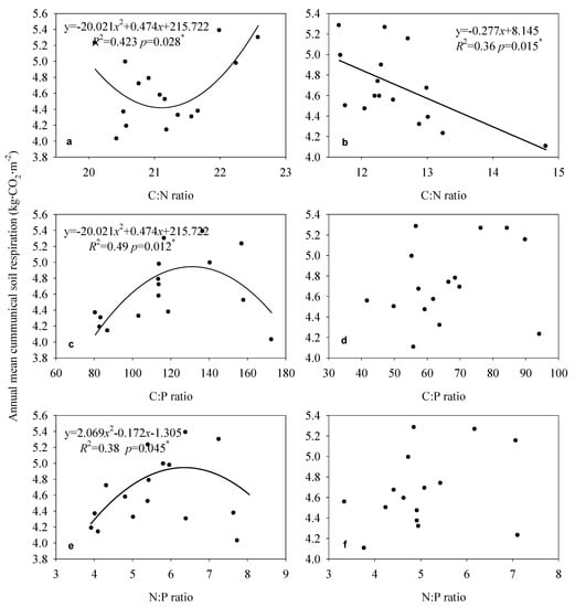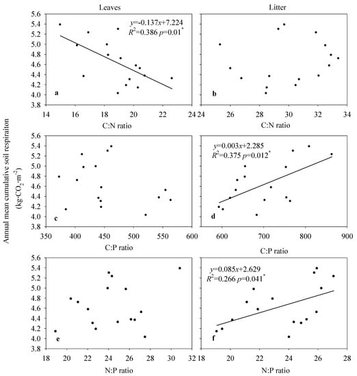 Plant and soil stoichiometry have interactive effects on nutrient cycling []. Nutrient return from leaves plays a major role in decomposition by soil organisms and the processes driving soil nutrient cycling []. In this study, soil cumulative CO2 emissions were negatively correlated with leaf C:N ratios (p < 0.05, Figure 7a), which may therefore indirectly influence soil respiration by litter decomposition rate. These results are inconsistent with the report by Ferlian et al. [], where soil C:N ratios were not significantly correlated with C and N concentrations in aboveground tissues or their stoichiometry, and leaf C:N ratios were therefore poor predicators of soil respiration rates. In this study, soil cumulative CO2 emissions were not significantly correlated with leaf C:P ratios, indicating that leaves were poor indicators of soil respiration rates due to large differences in nutrient content between leaves and litter (Figure 1e). Thus, leaf C:P ratios may also be poor indicators of soil respiration rates.