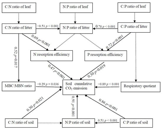 The structural equation model showed the interaction effect relationship of above- and belowground stoichiometry on soil cumulative CO2 emission. Cumulative soil CO2 emissions were positively correlated with N and P resorption efficiency and significantly negatively correlated SMC:SMN ratios (p = 0.036) and soil respiratory quotients (p < 0.001) (Figure 9).