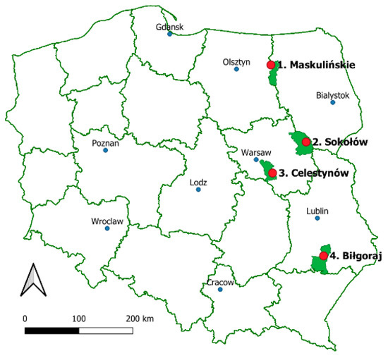 The general climatic conditions in the Maskulińskie Forest District are characterized by an average annual air temperature of 6.7 °C, an average sum of annual precipitation of 585 mm, a short vegetation period lasting approximately 190–200 days and snow cover deposition for approximately 90 days. In the Sokołów Forest District, the average annual air temperature is 8.0 °C, the average total annual rainfall is 522 mm, the growing season lasts about 200 days and the snow cover remains for about 95 days. In the Celestynów Forest District, the average annual air temperature is 9.3 °C, the average total annual rainfall is 578 mm, the growing season lasts approximately 200 days and snow cover remains for approximately 90 days. In the Biłgoraj Forest District, the average annual air temperature is 7.6 °C, the average total annual rainfall is 635 mm, the growing season lasts approximately 200–210 days and the snow cover remains for approximately 85–90 days [19,20,47,48,49]. Detailed climatic data used in the analyses, including monthly average air temperatures and monthly precipitation totals for the Hydrological and Meteorological Stations in Mikołajki, Siedlce and Jarocin (the closest in relation to the research plots), were provided by the Polish Institute of Meteorology and Water Management—National Research Institute [50].