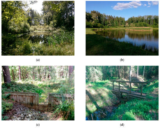 Retention reservoir in the Maskulińskie (a) and Sokołów (b) forest districts, dams damming water in the Celestynów (c) and Biłgoraj (d) forest districts [19,47,48,49].