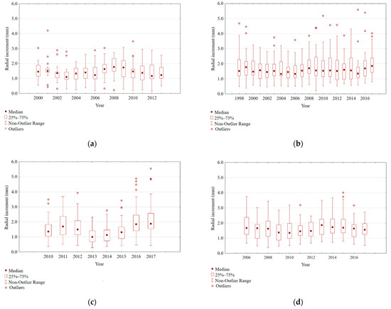 In the Maskulińskie Forest District, the highest average values of increments were achieved in the three consecutive years after the reservoir reconstruction (2007—1.66 mm, 2008—1.76 mm, 2009—1.70 mm), while the variability expressed by the standard deviation (SD) in 2007–2010 increased, and then gradually decreased. The smallest increment values were recorded in 2012 (0.16 mm) and 2006 (0.18 mm), and the largest in 2001 (4.30 mm), 2010 (3.49 mm) and 2009 (3.08 mm).