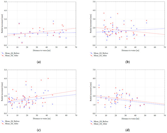 Comparing the mean values of increments before (Zd_Before) and after (Zd_After) construction of hydrotechnical facilities depending on the distance using linear regression and correlation, no statistically significant differences were found (Table 5). However, it is worth emphasizing the increase in the positive correlation index in the Maskulińskie Forest District from 0.06 to 0.35, which may indicate an increase in the mean increment with distance. On the other hand, the value of the correlation in the Sokołów Forest District decreased from a positive 0.13, to a negative −0.18, which may mean a decrease in average increments depending on the distance. With regard to the average values of increments after the construction of the valves, only in the Celestynów Forest District (Zd_After) can a trend of increased growth be observed (Figure 4). The reaction of trees by increasing or decreasing increments could be a stress effect, shaping their width [67,68,69]. This is consistent with the observations of Kalliokoski [71], who investigated, inter alia, the range of Scots pine roots and Szymkiewicz [72], examining the impact of melioration on the development of pine stands.