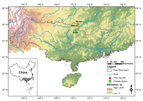 Map of the Pearl River basin showing the location of the tree-ring sampling site (red triangle) and two nearby meteorological stations (green circle).